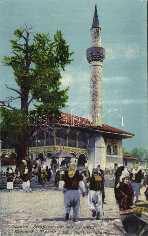 Albanian street scene with mosque https://www.darabanth.com/hu/145-Gyorsarveres/145.0/Kepeslapok/Folklor~500052/Albanian-street-scene-with-mosque~II435357