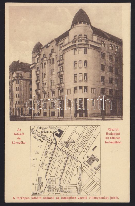 Leírás: Budapest XIII. Magyar Földrajzi Intézet, térképpel (cut / levágott)