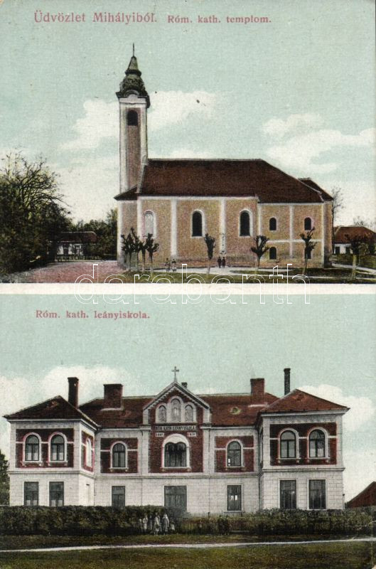 Mihályi Katolikus iskola és templom https://www.darabanth.com/hu/145-Gyorsarveres/145.0/Kepeslapok/Magyarorszag~500006/Mihalyi-Katolikus-iskola-es-templom~II432103