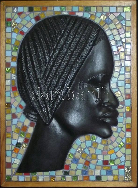 Leírás: Fock A. jelzéssel: Női fej kisplasztika, fa-mozaik-kő. Falra akasztható 26x37 cm
