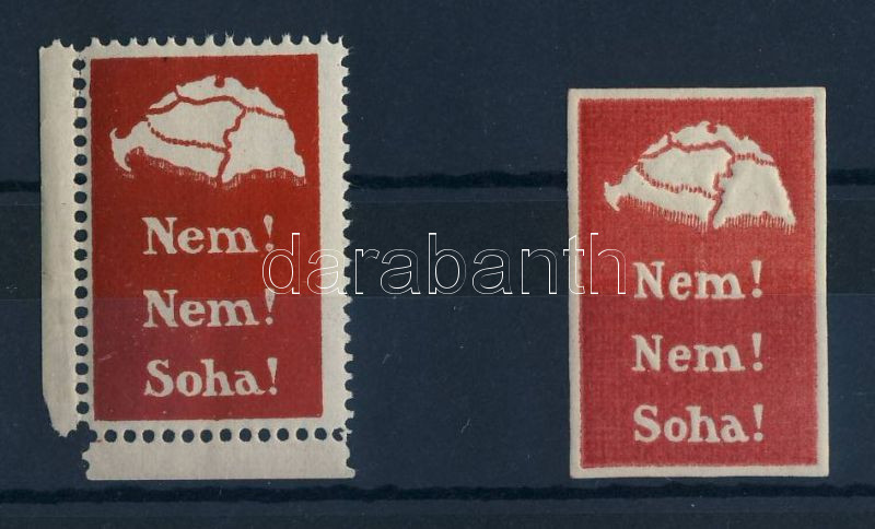 1920 Nem, Nem, Soha fogazott + vágott (dombor) irredenta levélzáró https://www.darabanth.com/hu/146-Gyorsarveres/146.0/Festmeny-mutargy-papirregiseg-egyeb/Parafilatelia~224/1920-Nem-Nem-Soha-fogazott-plus-vagott-dombor-irredenta-levelzaro~II420589