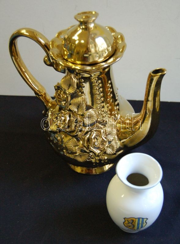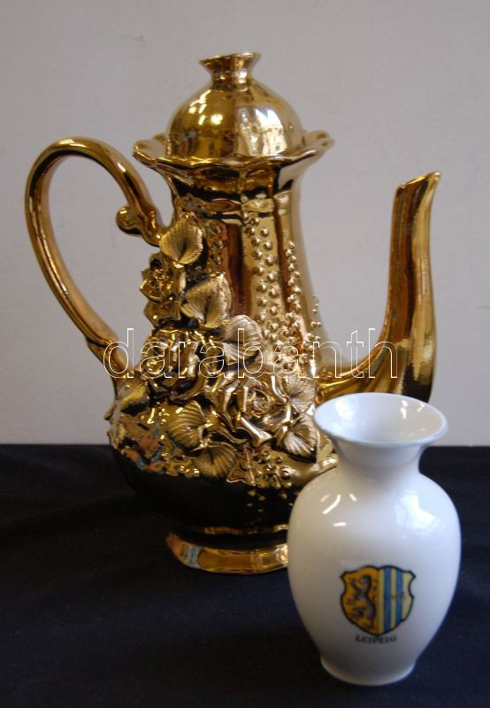 Leírás: Aranyozott porcelán teás kancsó és egy kis Leipzig porcelán váza