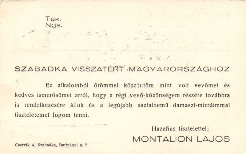 Leírás: Szabadka ´vissza´, advertisement of Lajos Montalion So.Stpl