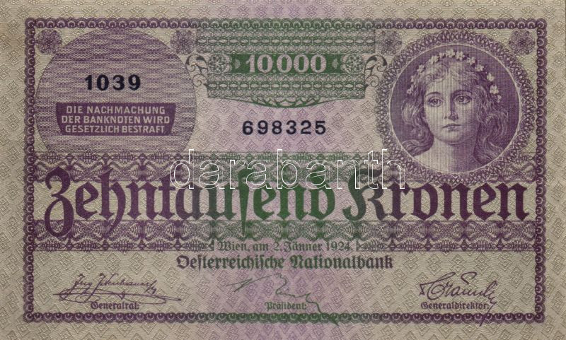 Ausztria 1924. 10.000K T:II https://www.darabanth.com/hu/146-Gyorsarveres/146.0/Numizmatika/Kulfoldi-bankjegyek~500111/Ausztria-1924-10000K-TII~II437187