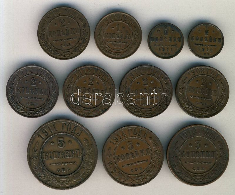 Cári Oroszország 1911-1914. 1/2k (2x) + 1k + 2k (5x) + 3k (2x) + 5k "I... https://www.darabanth.com/hu/146-Gyorsarveres/146.0/Numizmatika/Kulfoldi-fem-es-ezustpenzek~500112/Cari-Oroszorszag-1911-1914-12k-2x-plus-1k-plus-2k-5x-plus-3k-2x-plus-5k-II-Miklos-T2-2-3~II428535