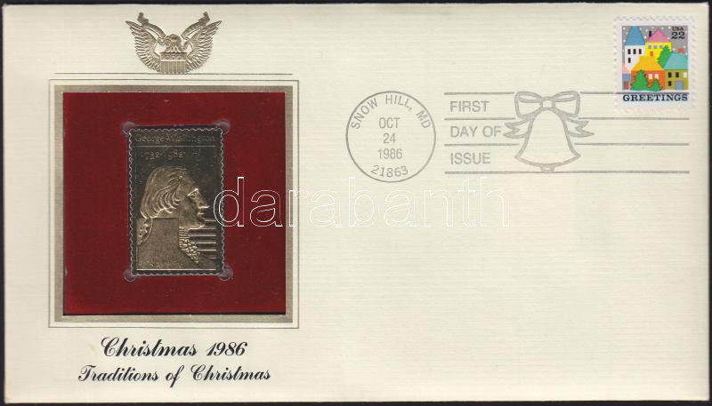 Leírás: USA 1986. 2db bélyeg replika- aranyozott emlékplakett borítékban, bélyeggel és elsőnapi bélyegzővel karácsonyi kiadás T:1