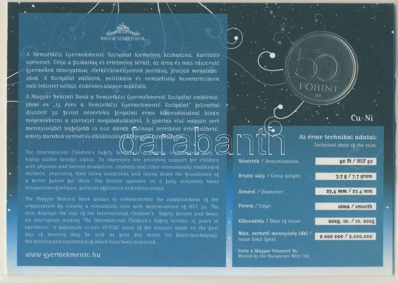 2005. 50Ft "Nemzetközi Gyermekmentő Szolgálat" elsőnapi veret számozot... https://www.darabanth.com/hu/146-Gyorsarveres/146.0/Numizmatika/Magyar-fem-es-ezustpenzek~500108/2005-50Ft-Nemzetkozi-Gyermekmento-Szolgalat-elsonapi-veret-szamozott-emleklapon-T1~II439009