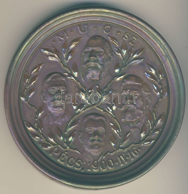 Leírás: 1900. IV.16. Pécs "M.U.O.SZ." kerámia emlékplakett T:2 díszdobozban