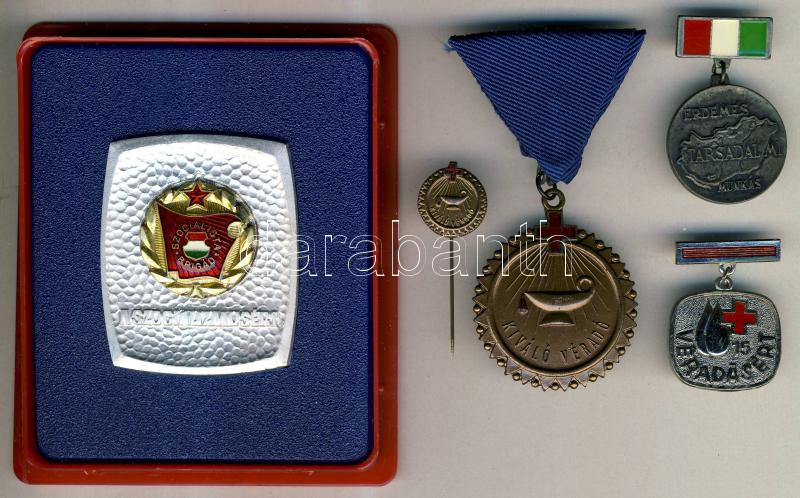 Leírás: 4db klf szocialista jelvény kiváló brigád, kiváló véradásért és érdemes társadalmi munkásságért, dísztokban T:2