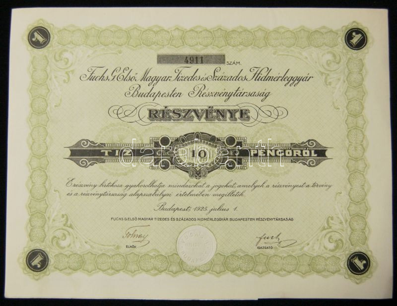 1925. Fuchs G. Első Magyar Tizedes és Százados Hidmérleggyár Budapeste... https://www.darabanth.com/hu/146-Gyorsarveres/146.0/Numizmatika/Reszvenyek-Ertekpapirok-Sorsjegyek~500105/1925-Fuchs-G-Elso-Magyar-Tizedes-es-Szazados-Hidmerleggyar-Budapesten-Reszvenytarsasag-rC3~II437822