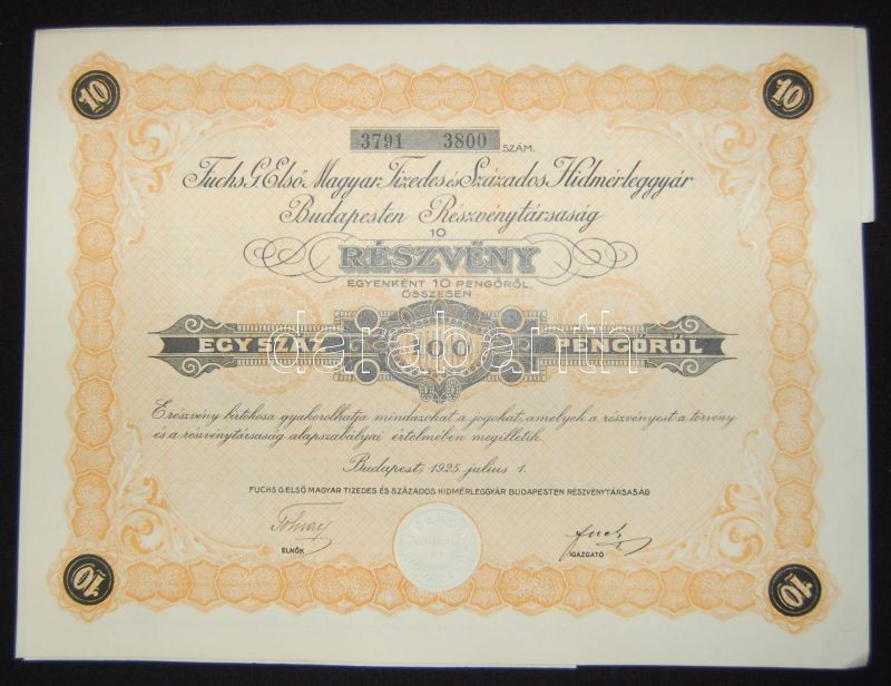 1925. "Fuchs G. Első Magyar Tizedes és Százados Hidmérleggyár Budapest... https://www.darabanth.com/hu/146-Gyorsarveres/146.0/Numizmatika/Reszvenyek-Ertekpapirok-Sorsjegyek~500105/1925-Fuchs-G-Elso-Magyar-Tizedes-es-Szazados-Hidmerleggyar-Budapesten-Reszvenytarsasag-~II437817