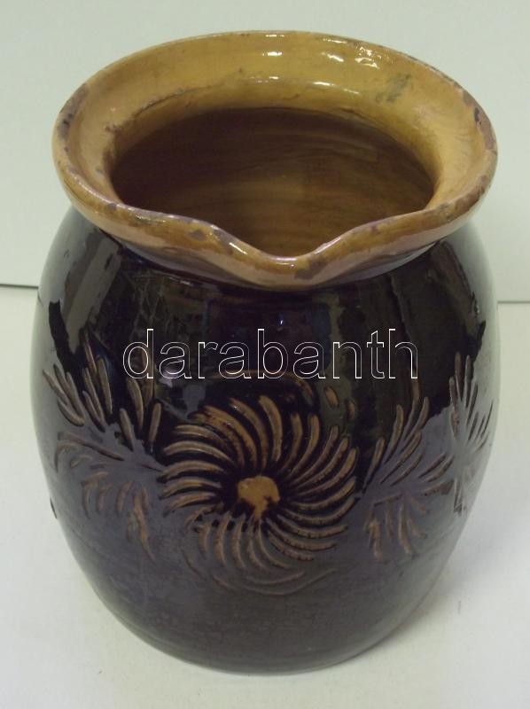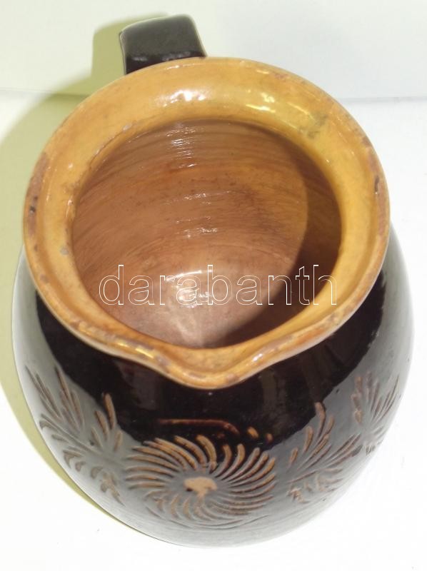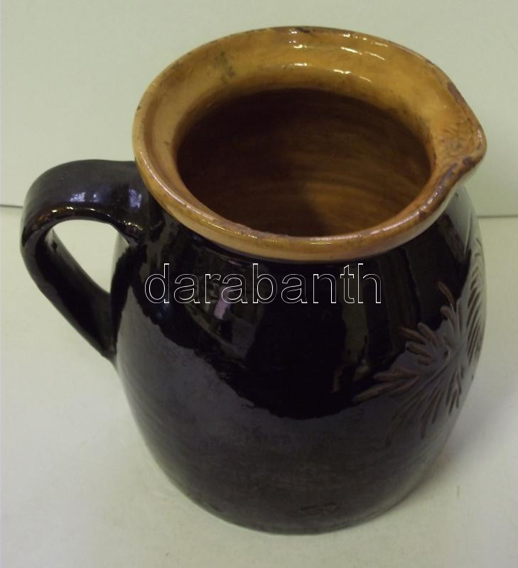 Leírás: XIX. századi mázas kerámia kancsó népi mintával, kis festékhibákkal 14cm magas