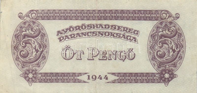 1944. 5P "V.H." alapnyomat függőleges, nyitott ékezet T:II- https://www.darabanth.com/hu/147-Gyorsarveres/147.0/Numizmatika/Magyar-bankjegyek~500111/1944-5P-VH-alapnyomat-fuggoleges-nyitott-ekezet-TII-~II441100