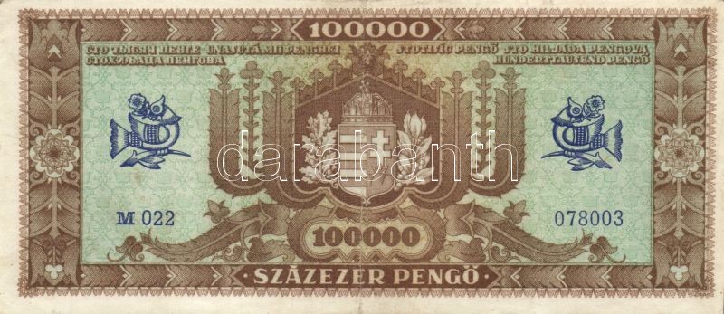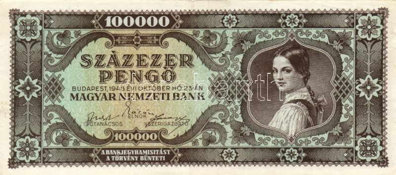 T:II,III https://www.darabanth.com/hu/147-Gyorsarveres/147.0/Numizmatika/Magyar-bankjegyek~500111/1945-100000P-2x-feltunoen-eltero-szinvaltozatok---TII-III~II441123