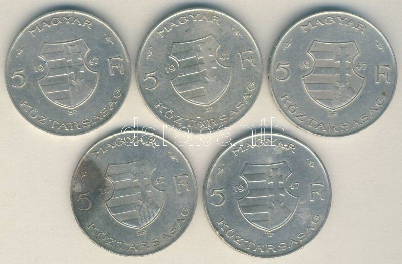 Leírás: 1947. 5Ft Ag (5x) "Kossuth" T:2,3+