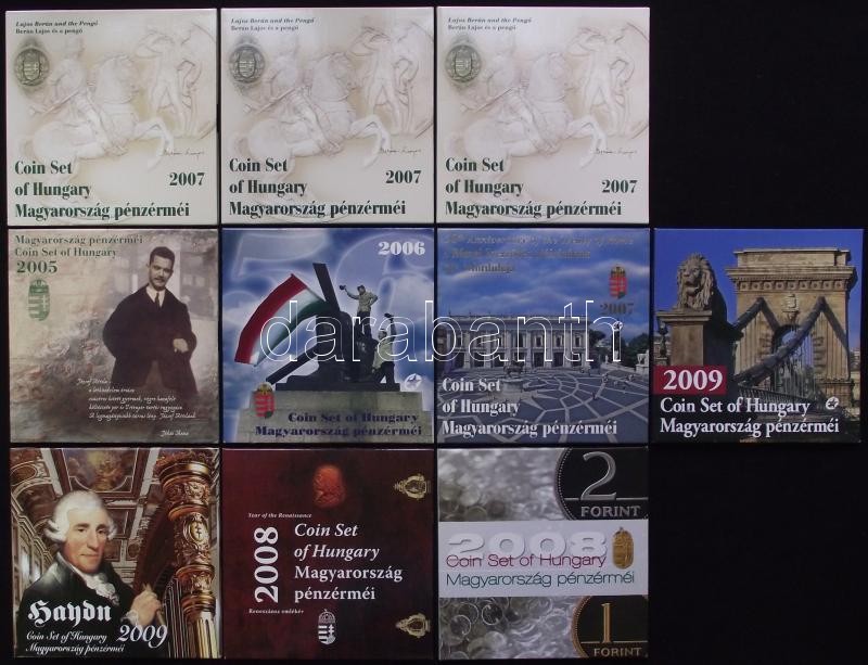 Gyűjtemény a "Magyarország Pénzérméi" sorozatból és 3db ezüstpénz: 1db 2006. 1Ft-100Ft 7klf db, szettben T:BU Csak 5000db! + 1db 2005. 1Ft-100Ft 7klf db + 10Ft "József Attila" szettben T:BU Csak 8000db! + 2db 2007. 1Ft-100Ft 8klf db, szettben, benne "Berán Lajos és a pengő" Ag (999) emlékérem T:BU Csak 2000db! R! + 1db 2007. 1Ft-100Ft 8klf db, szettben, benne "Berán Lajos és a pengő" Ag (999) emlékérem T:"PP" kivitelben! + 1db 2007. 1Ft-100Ft 8klf db, szettben, benne 50Ft "50 éves a Római Szerződés" T:PP Csak 5000db! + 1db 2008. 1Ft-100Ft 7klf db, szettben T:PP Csak 4000db! + 1db 2008. 1Ft-100Ft 7klf db + Mátyás denár Ag fantáziaverete "Reneszánsz emlékév" szettben T:PP Csak 3000db! + 1db 2009. 5Ft-200Ft 6klf db + "Joseph Haydn" Ag (999) emlékérem, szettben T:PP Csak 4000db! + 1db 2009. 5Ft-200Ft 6klf db szettben "Lánchíd" T:PP Csak 5000db! + 1948. 5Ft Ag "Petőfi" + 10Ft Ag "Széchenyi" (2x) T:2 ph. Összesen 10db szett és 3db ezüstpénz!