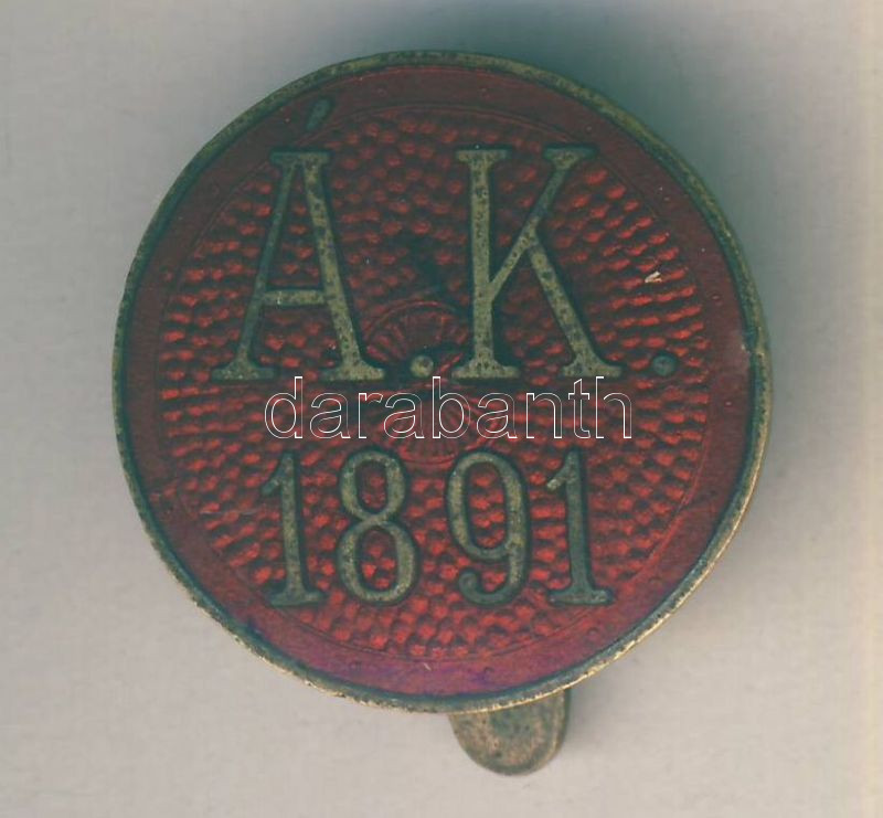 Leírás: "Á.K. 1891." zománcozott Br gomblyukjelvény készítő:Morzsányi J. Budapest T:2