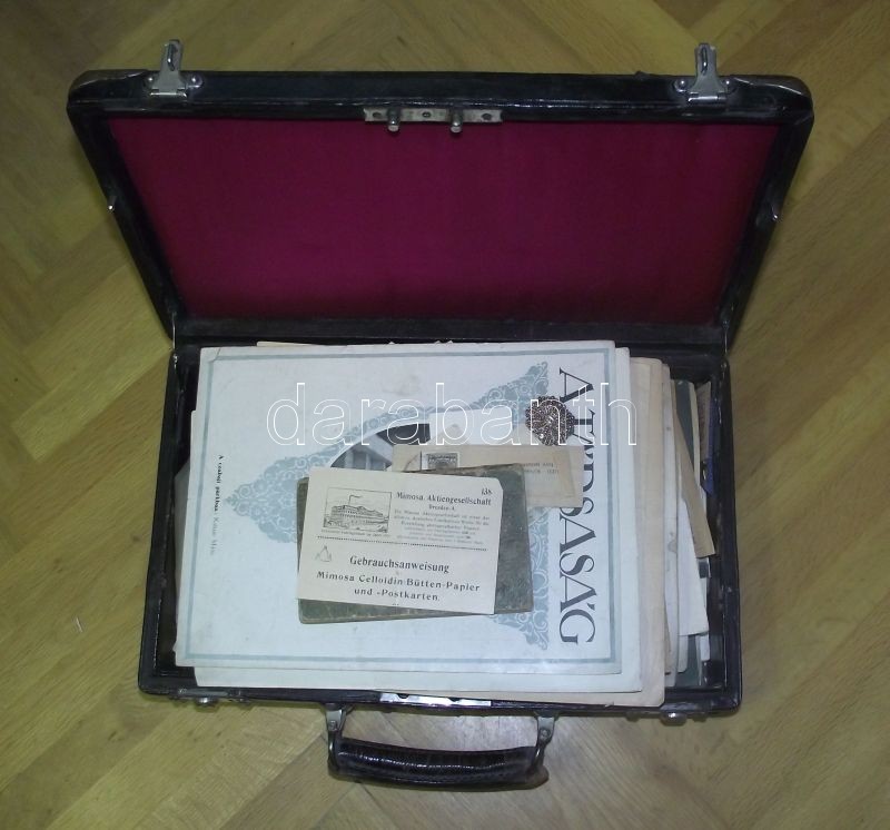 Leírás: Több száz darabos vegyes hagyaték fotó, nyomtatvány, okmány tétel régi bőr-kofferban