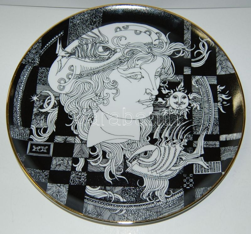 Szász Endre által tervezett Hollóházi jelzett porcelán tál eredeti dobozban / Faces designed by Endre Szasz Hollohaza chinaware plate in original box 25 cm