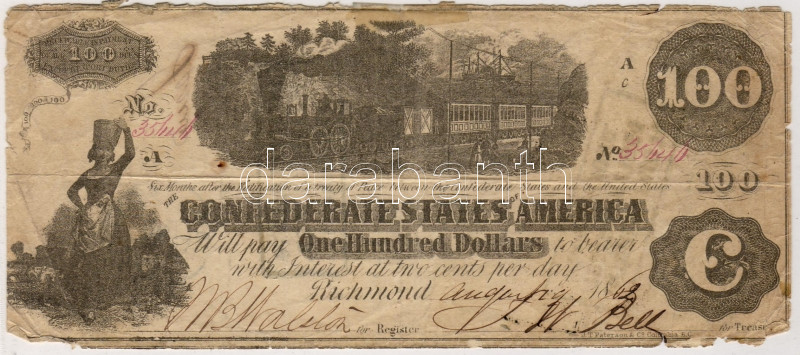 Confederate States 1862 100$ hátoldalán postabélyegzővel RR!! T.IIII https://www.darabanth.com/hu/15-Gyorsarveres/15.0/Numizmatika/Numizmatika-Bankjegyek~89/Confederate-States-1862-100USD-hatoldalan-postabelyegzovel-RR-TIIII~II24709