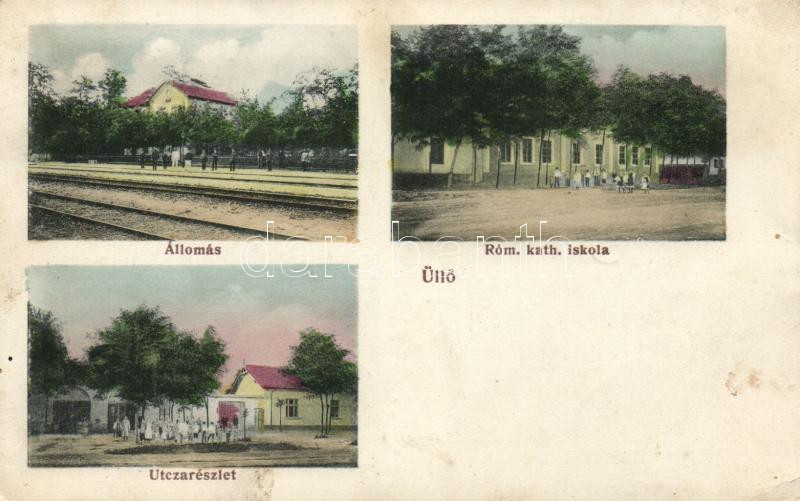 Leírás: Üllő vasútállomással, Bergner Margit kereskedésével, Divald & Monostory (EK)