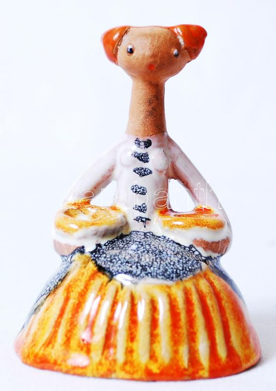 Leírás: Kiss Roóz Ilona (1923-2010): Tálakat cipelő női figura. Mázas kerámia, alján jelzett, hibátlan, m:10 cm