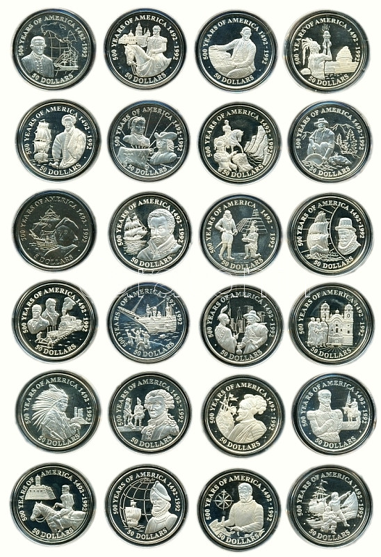 Cook-szigetek 1989-1993. "Amerika felfedezésének 500. évfordulója" alkalmából kiadott ezüst érem gyűjtemény 53db kizárólag különféle és értékesebb darabbal a következő felosztásban: 5$ Ag (1 x 9.85g/0.5) T:BU + 10$ Ag (2 x 10g/0.925) T:PP + 50$ Ag (50 x 31.1g/0.999) T:PP /