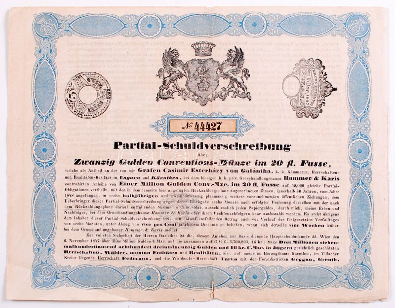 Austria / Vienna 1847. "Partial Convertible Bond of count Kasimir Esterhazy" with dry-seal C:folded, tear