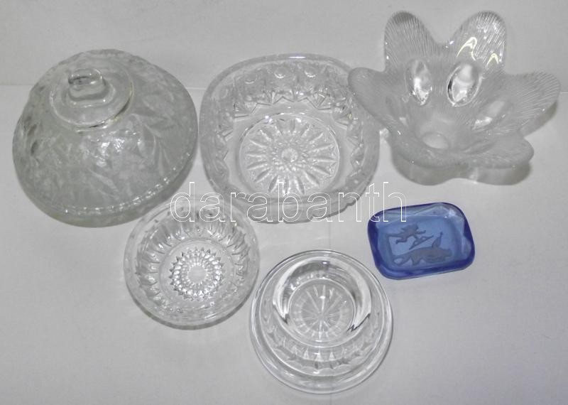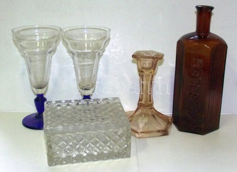 Leírás: Vegyes üveg tétel: poharak, vázák, ékszeres dobozka, gyertyatartó, gyógyszeres üveg, stb.