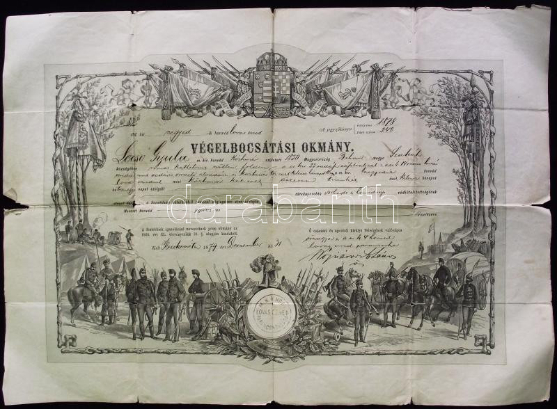1879 Díszes katonai végelbocsájtási okmány megviselt állapotban 50x36 ... https://www.darabanth.com/hu/150-Gyorsarveres/150.0/Festmeny-mutargy-papirregiseg-egyeb/Militaria~49/1879-Diszes-katonai-vegelbocsajtasi-okmany-megviselt-allapotban-50x36-cm~II457134