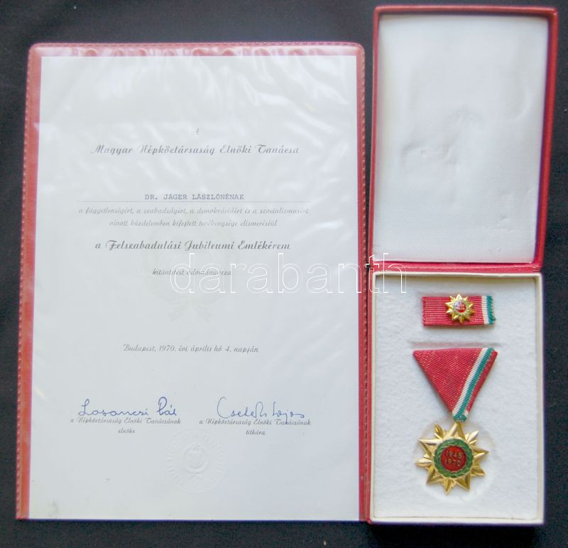 Leírás: 1970. "Felszabadulási Jubileumi Emlékérem" kitüntetés miniatűrrel, eredeti dísztokban adományozói okirattal T:1