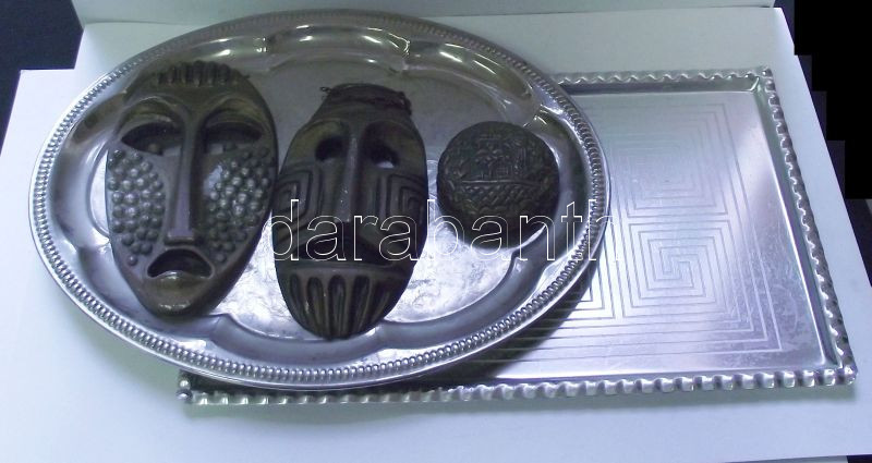 Leírás: 2db fém tálca, 2db falra akasztható réz maszk és egy réz edényke