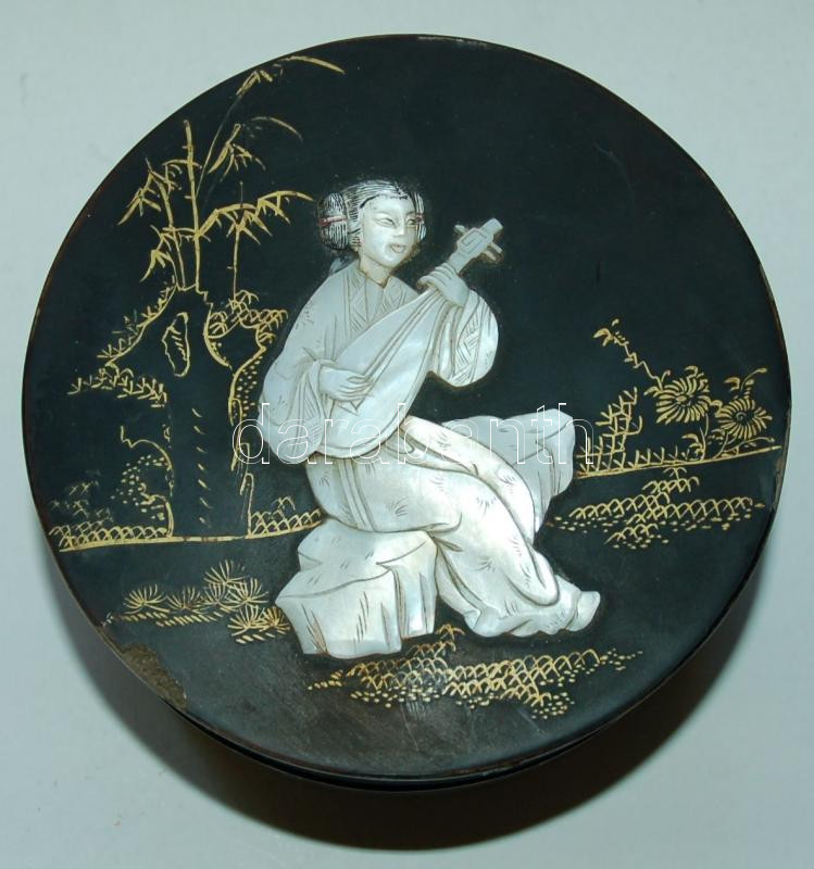Leírás: Régi, csontberakásos japán fa-doboz / Japanese wooden-box with bone-inlay d:14cm