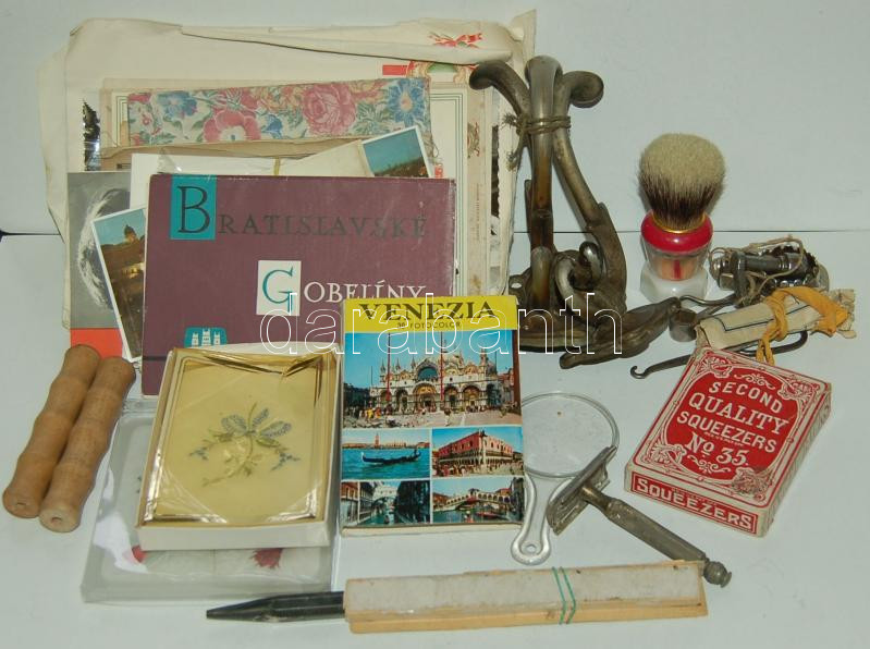 Leírás: Vegyes bolha tétel: vegyes régi iratok, fotók, kártyapakli, falikarok, fényképtartó, borotva, stb.