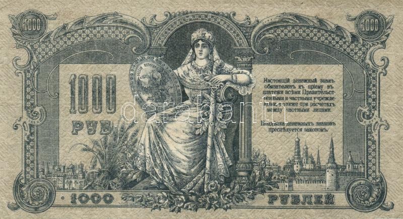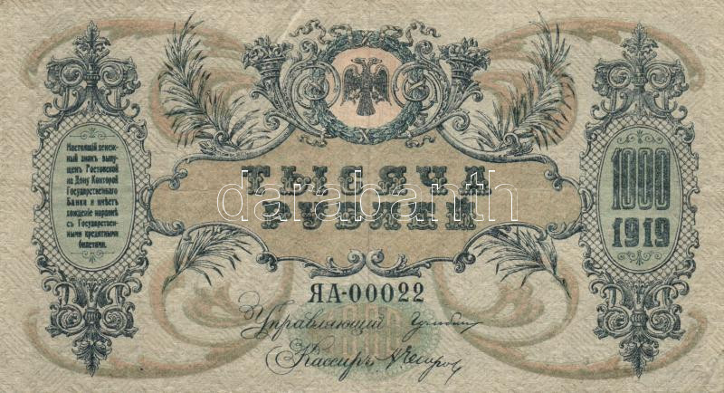 Russian Civil ... https://www.darabanth.com/hu/151-Gyorsarveres/151.0/Numizmatika/Kulfoldi-bankjegyek~500155/Orosz-PolgarhaboruDel-Oroszorszag-1919-1000R-TII---3Cbr3ERussian-Civil-WarSouth-Russia-191~II463901
