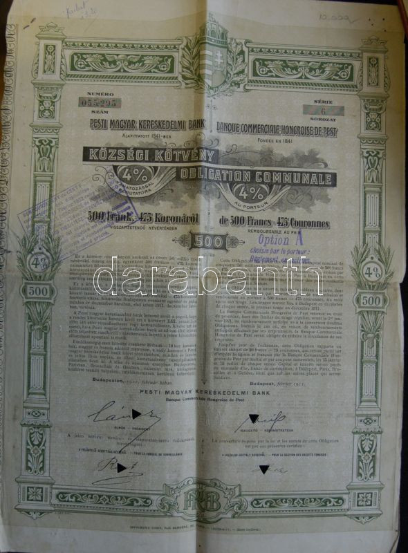 Leírás: 1911. Pesti Magyar Kereskedelmi Bank Községi kötvény 475K-ról (500Fr) magyar és francia nyelven szelvényekkel