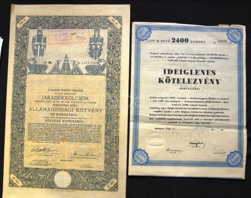 1915. A Magyar Korona Országai 6%-kal kamatozó Járadékkölcsön- államadóssági kötvénye 100K-ról szelvényekkel és "Gyámhatósági kezelés alá vétetett Kassa 1916...Abaúj-Torna Vármegye Árvaszéke" bélyegzővel + 1946. Ideiglenes Kötelezvény - Budapest Székesfőváros 2400K-ról