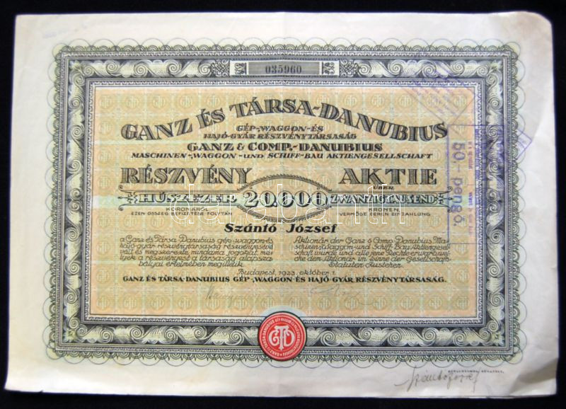 1923. Ganz és Társa-Danubius Részvénytársaság részvénye 20.000K-ról, n... https://www.darabanth.com/hu/151-Gyorsarveres/151.0/Numizmatika/Reszvenyek-Ertekpapirok-Sorsjegyek~500149/1923-Ganz-es-Tarsa-Danubius-Reszvenytarsasag-reszvenye-20000K-rol-nemet-es-magyar-nyel~II450363