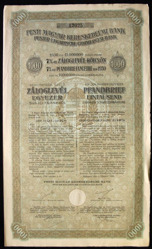 1930. Pesti Magyar Kereskedelmi Bank 7%-os Záloglevél-Kölcsön 1000 svá... https://www.darabanth.com/hu/151-Gyorsarveres/151.0/Numizmatika/Reszvenyek-Ertekpapirok-Sorsjegyek~500149/1930-Pesti-Magyar-Kereskedelmi-Bank-725-os-Zaloglevel-Kolcson-1000-svajci-Frankrol-szelvenyek~II466169
