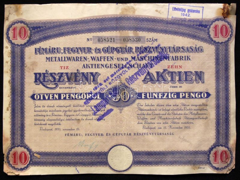 Leírás: 1935. "Fémáru-, Fegyver- és Gépgyár Részvénytársaság" részvénye 50P-ről, német és magyar nyelven, szelvényekkel, felülbélyegezve (sérült)