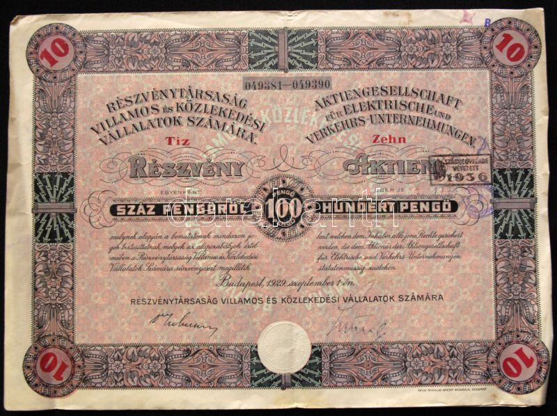 Budapest 1929. "Részvénytársaság Villamos és Közlekedési Vállalatok sz... https://www.darabanth.com/hu/151-Gyorsarveres/151.0/Numizmatika/Reszvenyek-Ertekpapirok-Sorsjegyek~500149/Budapest-1929-Reszvenytarsasag-Villamos-es-Kozlekedesi-Vallalatok-szamara-10-reszveny~II464695