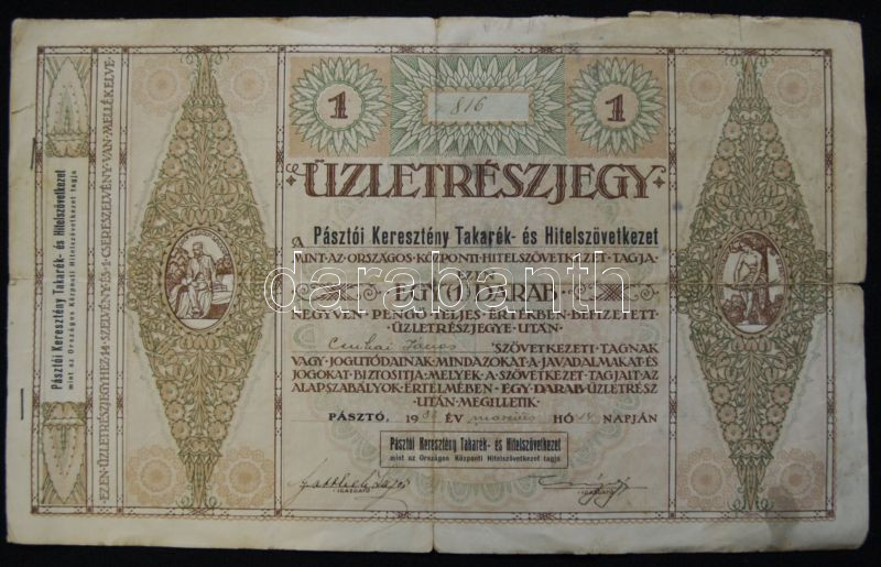 Pásztó 1933. "Pásztói Keresztény Takarék-és Hitelszövetkezet" üzletrés... https://www.darabanth.com/hu/151-Gyorsarveres/151.0/Numizmatika/Reszvenyek-Ertekpapirok-Sorsjegyek~500149/Paszto-1933-Pasztoi-Kereszteny-Takarek-es-Hitelszovetkezet-uzletreszjegye-40P-rol~II464089