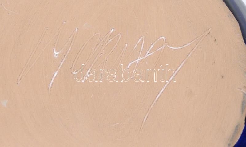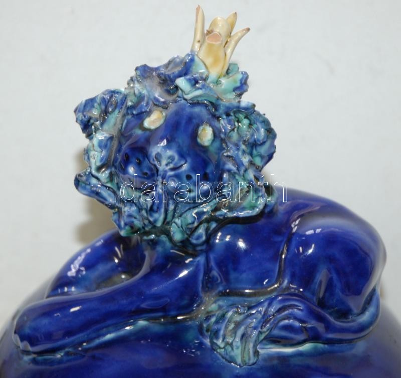 Leírás: Morvay Zsuzsa (1946): Oroszlánkirály. Mázas kerámia bonbonniere. (korona sérült) / Lion-king artist signed ceramic bonbonniere 25 cm