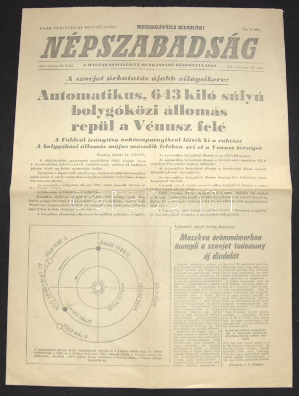 1961 Népszabadság című napilap rendkívüli kadása A szovjet automatikus... https://www.darabanth.com/hu/152-Gyorsarveres/152.0/Festmeny-mutargy-papirregiseg-egyeb/Nyomtatvanyok~236/1961-Nepszabadsag-cimu-napilap-rendkivuli-kadasa-A-szovjet-automatikus-urallomas-Venuszra~II470140