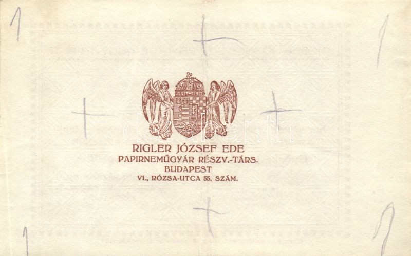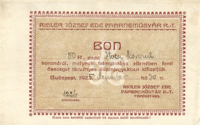 Leírás: 1925. Rigler József Ede Papírnemügyár Rt. 50K értékű bón T:II