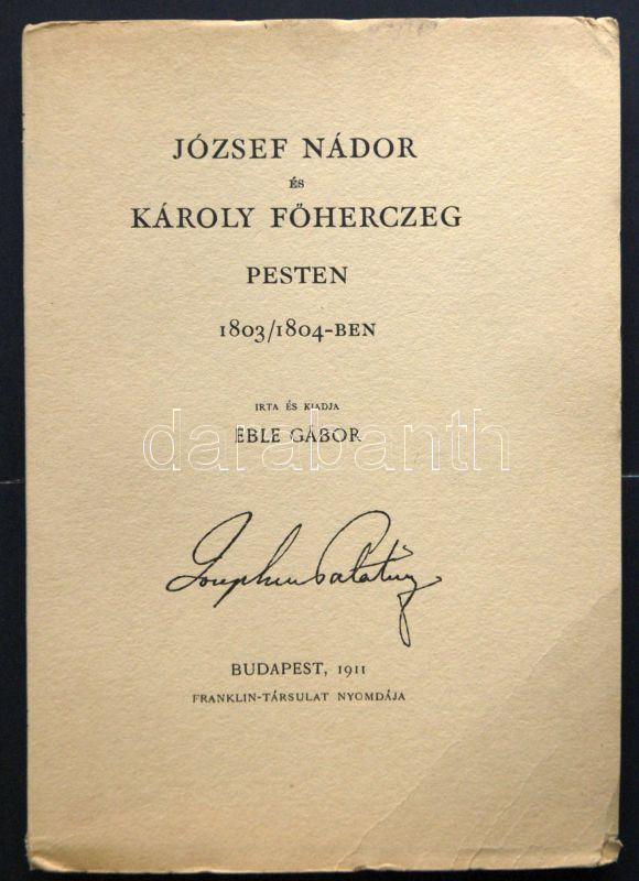1911 Éble Gábor: József Nádor és Károly Főherceg Pesten 1803/1804-ben,... https://www.darabanth.com/hu/153-Gyorsarveres/153.0/Festmeny-mutargy-papirregiseg-egyeb/Konyvek-Egyeb-ritkasagok~500027/1911-Eble-Gabor-Jozsef-Nador-es-Karoly-Foherceg-Pesten-18031804-ben-Franklin-Tarsulat-kia~II465908