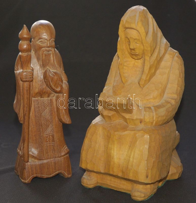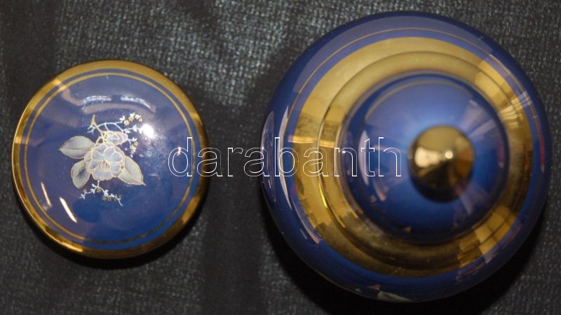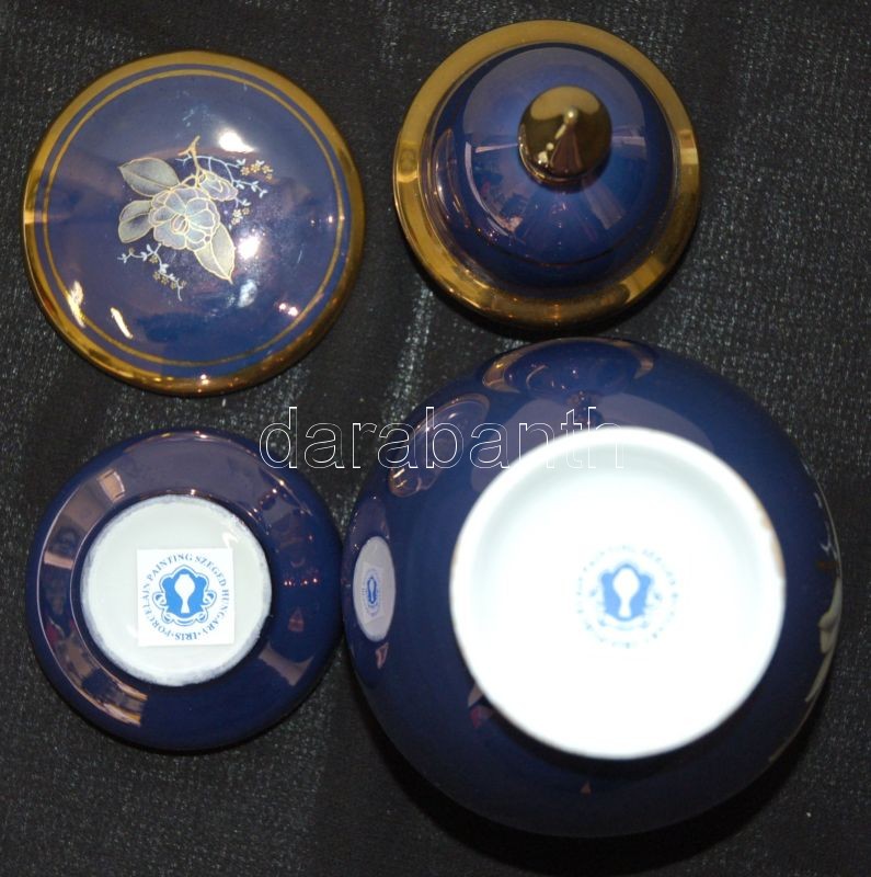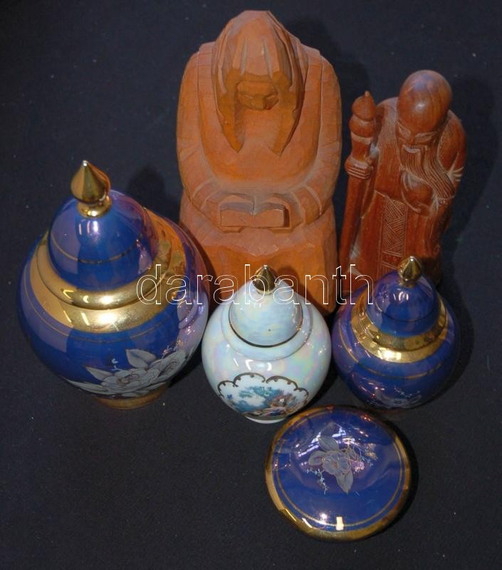 Kézzel festett porcelán edényke fedővel, lia arany díszítéssel Szeged Gabonakutató 1998 felirattal + porcelán edényke + 2db dekoratív porcelán üvegcse 10cm magas + 2db kis méretű faragott fa szobor, az egyik jelzett