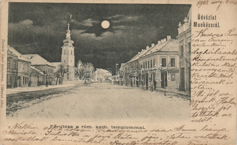 Munkács main street, Catholic church at night (wet damage) https://www.darabanth.com/hu/153-Gyorsarveres/153.0/Kepeslapok/Karpatalja~500040/Munkacs-main-street-Catholic-church-at-night-wet-damage~II477125