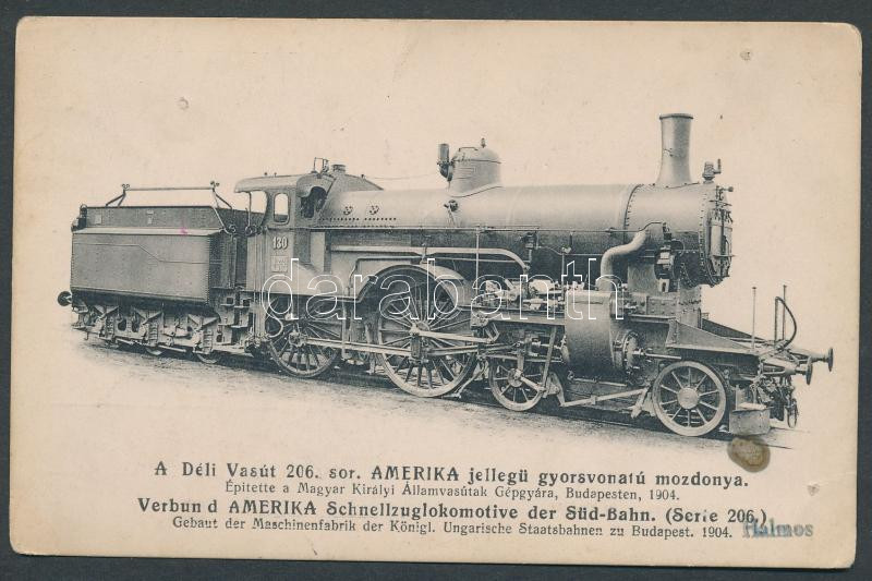 MÁV Déli vasút 206. Amerika, locomotive (pinhole) https://www.darabanth.com/hu/153-Gyorsarveres/153.0/Kepeslapok/Vonat~500114/MAV-Deli-vasut-206-Amerika-locomotive-pinhole~II477294