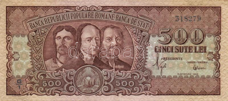 Romania 1949. 15.10. 500 Lei C:XF https://www.darabanth.com/hu/153-Gyorsarveres/153.0/Numizmatika/Kulfoldi-bankjegyek~500131/Romania-1949-oktober-15-500L-TII-3Cbr3ERomania-1949-1510-500-Lei-CXF~II476572